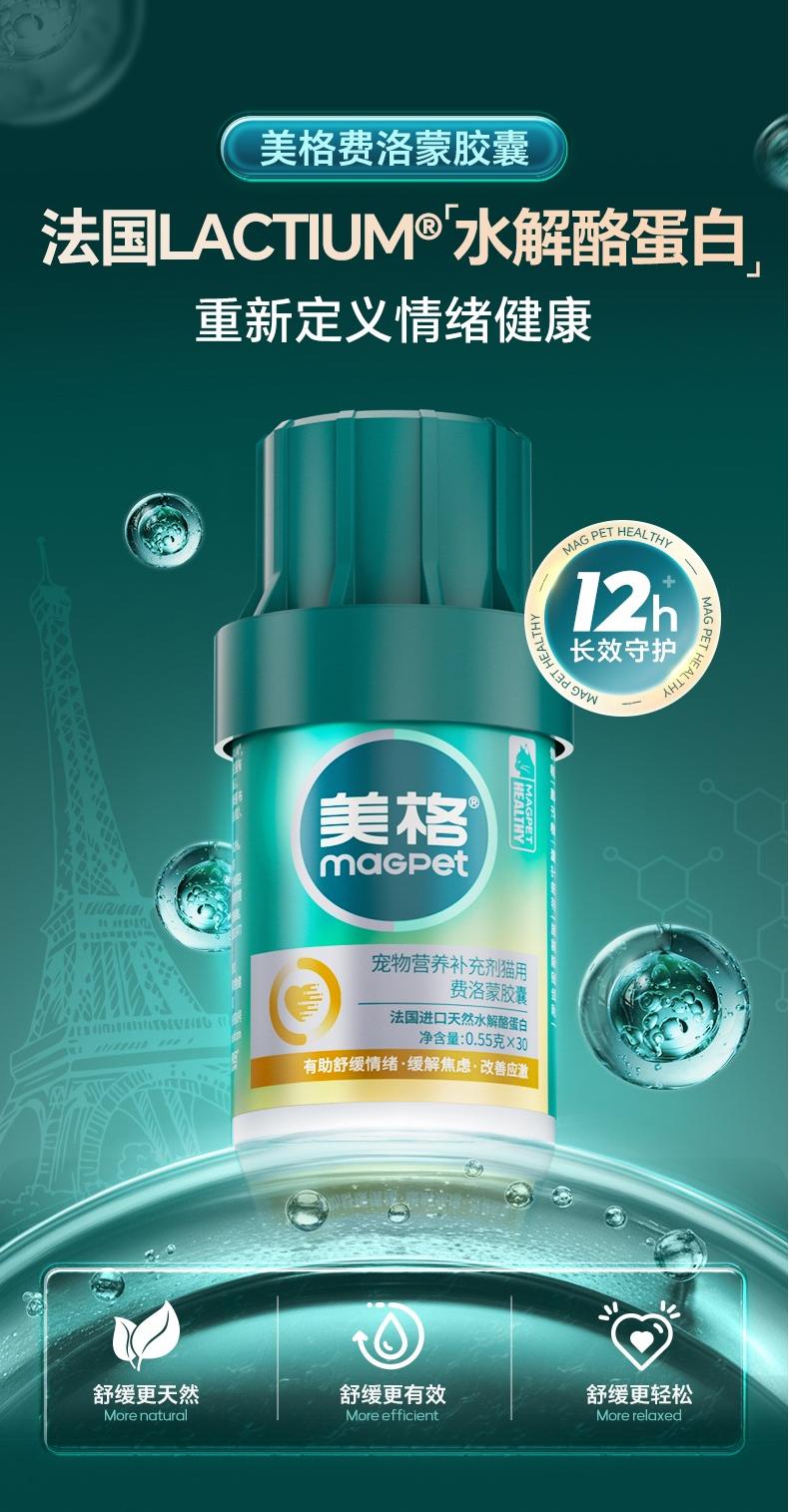 MAG费洛蒙胶囊:添加法国LACTIUM®水解酪蛋白及L-色氨酸等成分,多通路协同调节压力激素,舒缓情绪,减少应激。喂食后1-2小时起效,持续舒缓12-24小时,专为寄养分离、环境改造、多宠共处等长期压力场景设计,从肠道到神经的“情绪稳定器”。